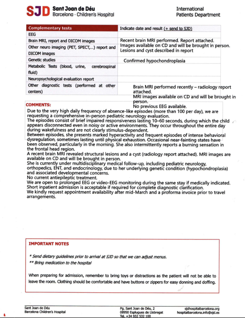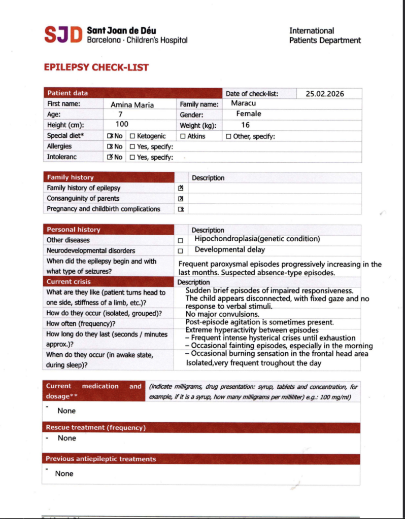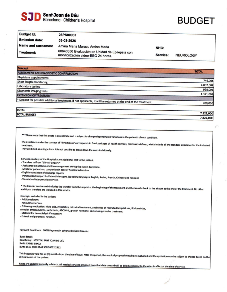 Documentele medicale confirmă gravitatea situației. Bugetul emis de spital ajunge la 7.822 de euro . Suma include consultații, monitorizare neurologică video-EEG timp de 24 de ore, analize și investigații imagistice, toate necesare pentru Amina.