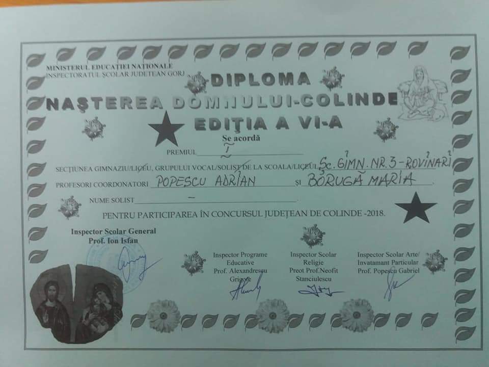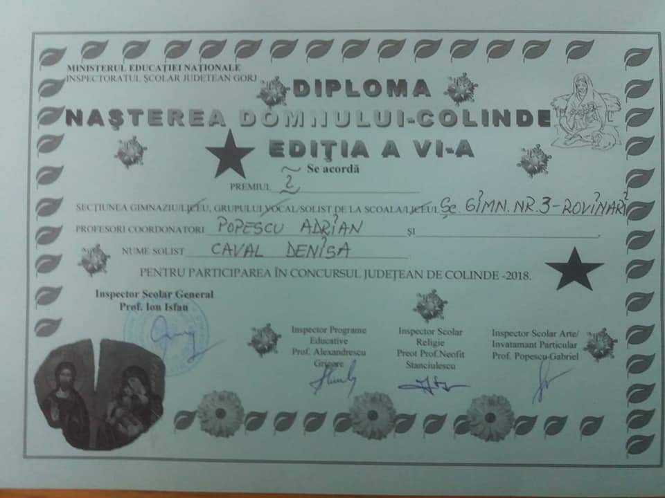 O parte din elevii care au participat la acest proiect, au reprezentat cu succes Școala Gimnazială Numărul 3 din Rovinari la Concursul Județean de Colinde ,,Nașterea Domnului” desfășurat la Colegiul Economic ,,Virgil Madgearu” din Târgu Jiu, în data de 21 decembrie, unde au obținut locul I la secțiunea grup vocal iar eleva Caval Denisa locul I la secțiunea solist vocal.