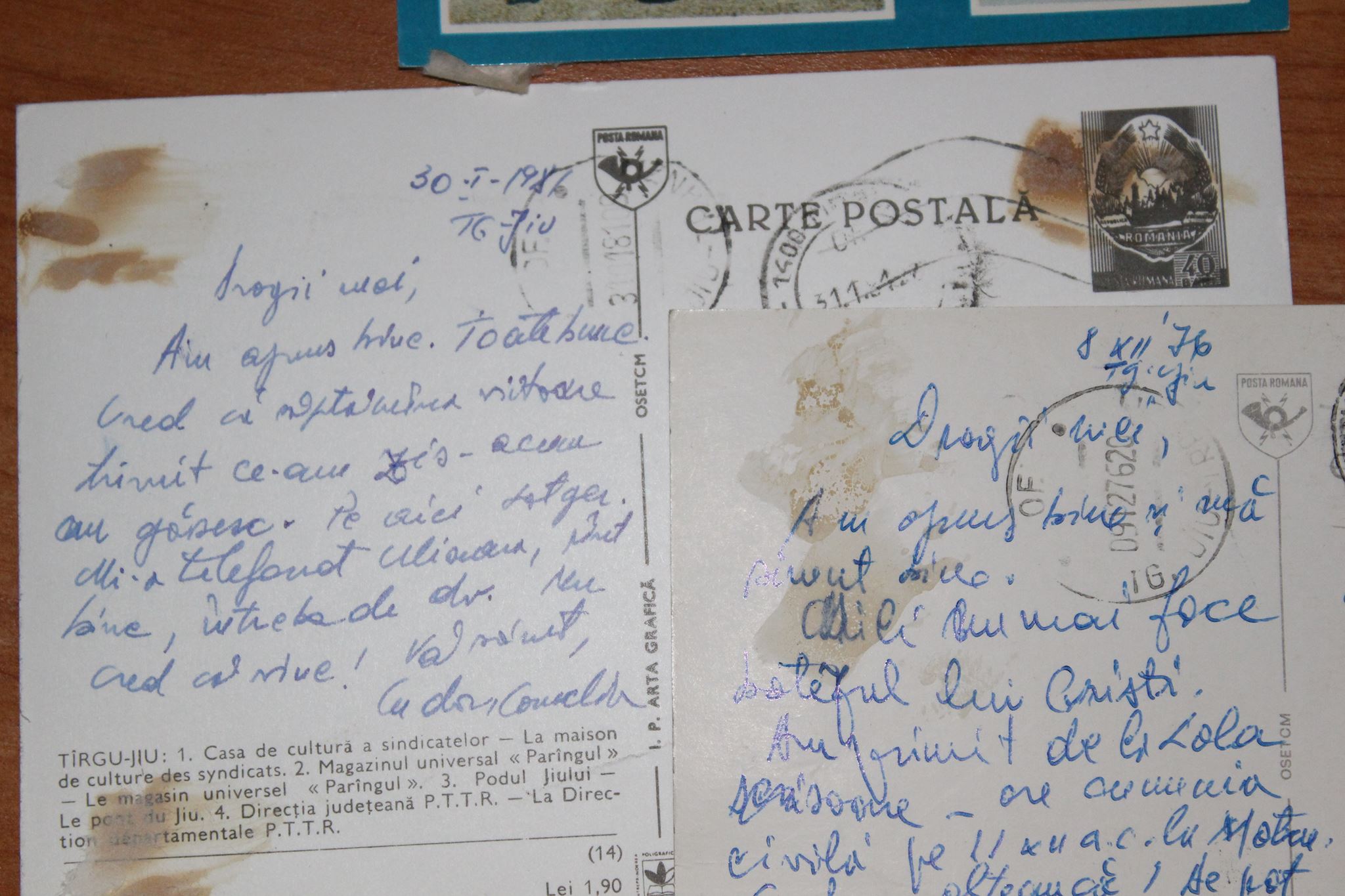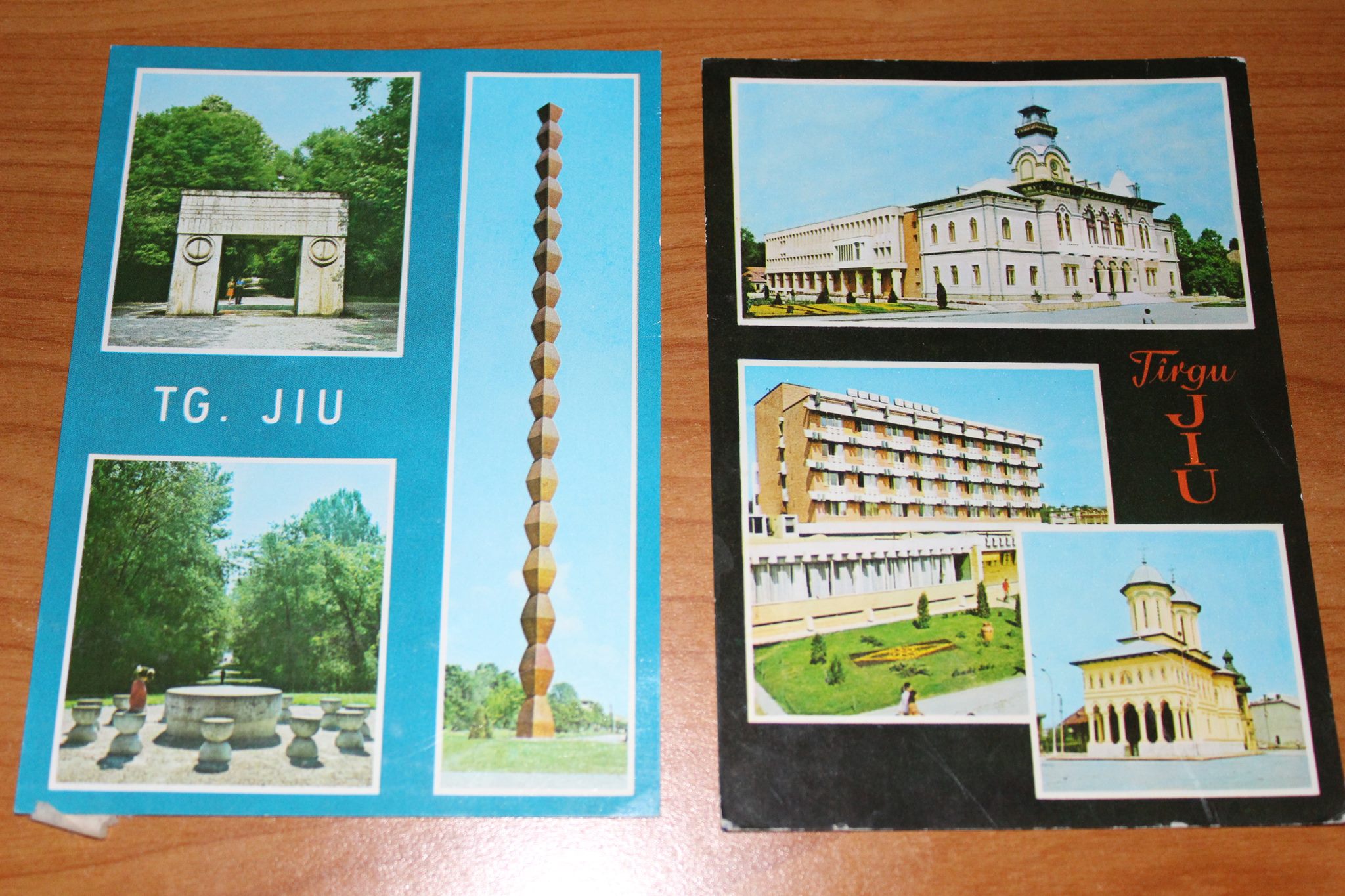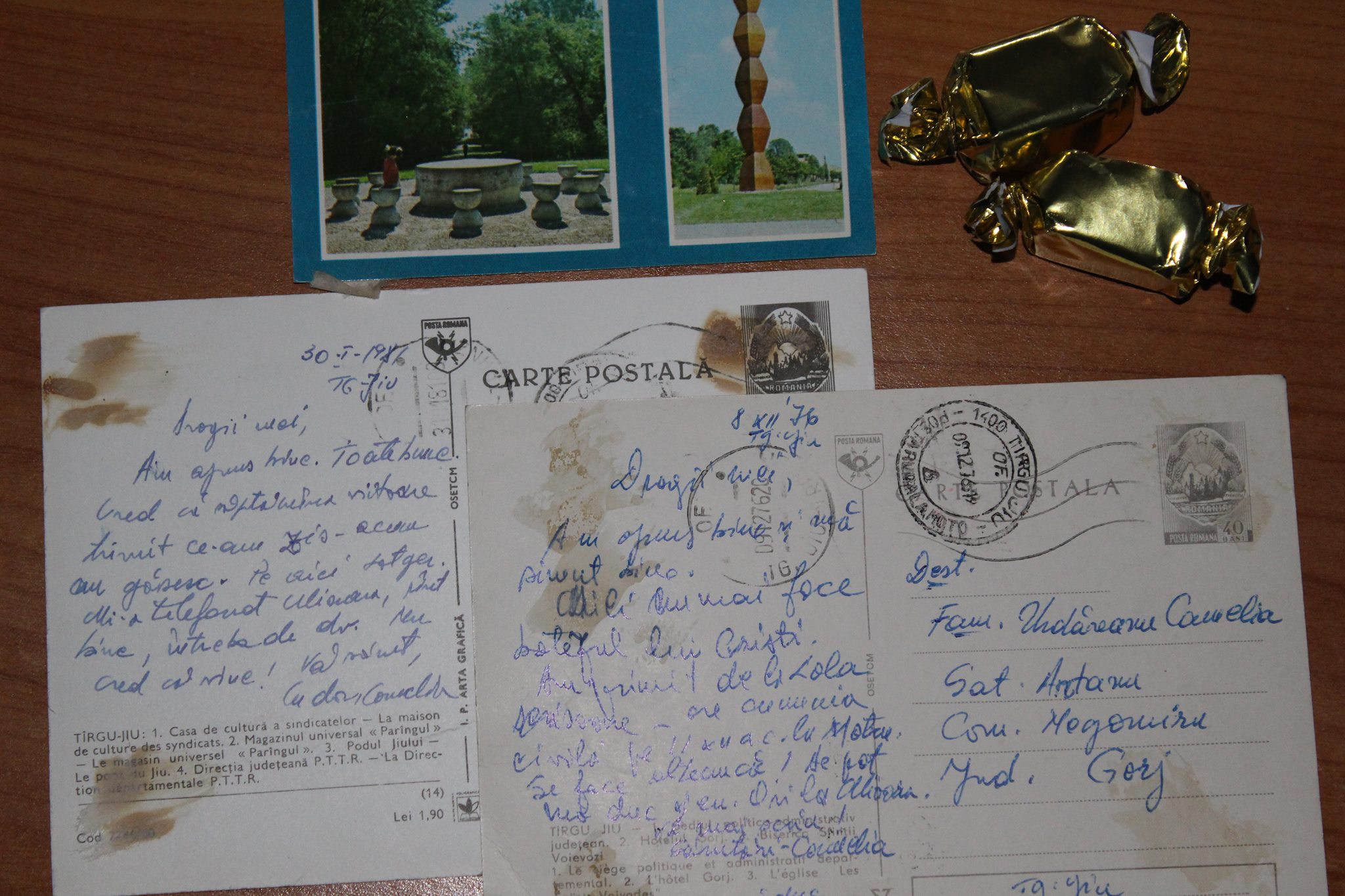 Cele trei ilustrate au fost trimise în perioada anilor 1976-1982 și prezintă frumoase imagini din Târgu-Jiu. În una dintre ilustrate sunt trei imagini cu operele lui Constantin Brâncuși, iar în celelalte două sunt fotografii ale unor clădiri reprezentative.