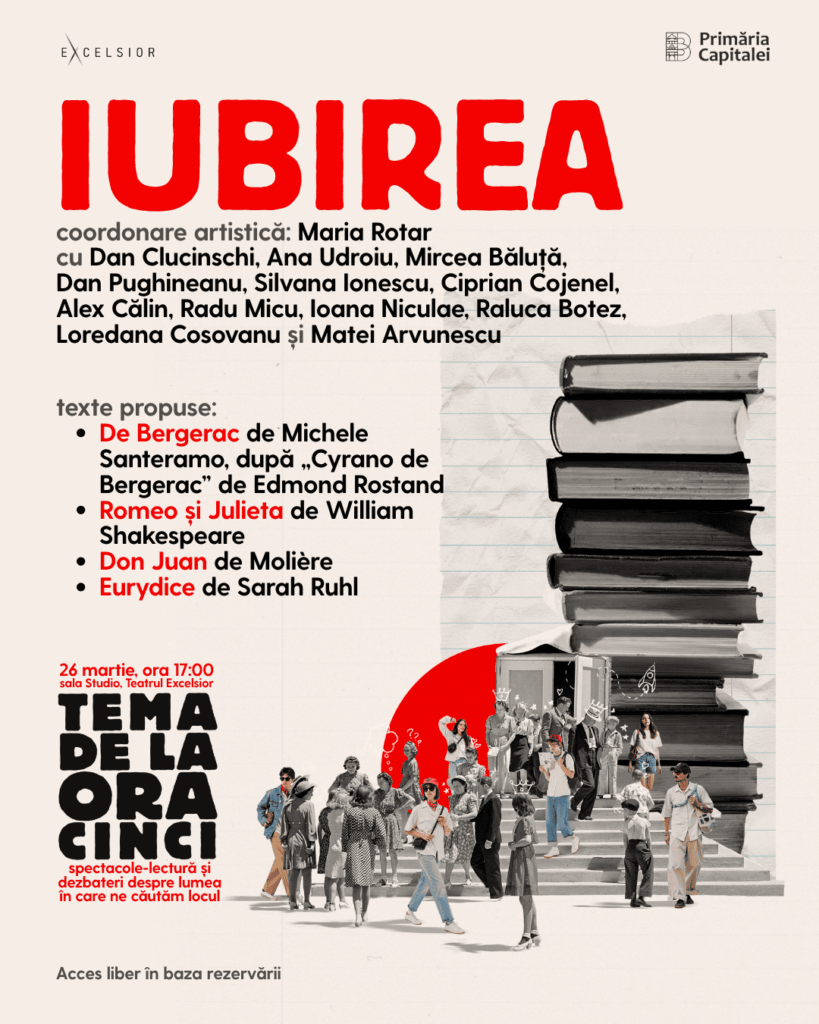 IUBIREA deschide seria de spectacole-lectură „Tema de la ora cinci”, organizată de Teatrul EXCELSIOR din București. Evenimentul are loc joi, 26 martie 2026, de la ora 17:00, în Sala Studio. Proiectul aduce în fața publicului tânăr o experiență directă, bazată pe text și dialog.