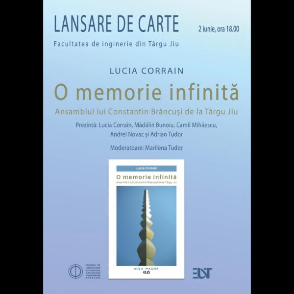 Luni, 2 iunie 2025, de la ora 18:00, la Facultatea de Inginerie din Târgu Jiu, va avea loc lansarea volumului „O memorie infinită. Ansamblul lui Constantin Brâncuși de la Târgu Jiu”, semnat de Lucia Corrain, o lucrare remarcabilă dedicată unuia dintre cele mai valoroase simboluri ale patrimoniului cultural românesc.