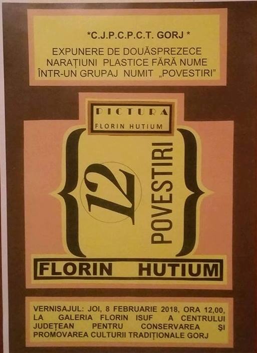 „Centrul Judeţean pentru Conservarea şi Promovarea Culturii Tradiţionale Gorj porneşte o serie de expoziţii cu artiştii plastici gorjeni care au fost prezenţi la Expoziţia «100 de artişti pentru 100 România» de la Sala Brâncuși a Palatul Parlamentului- Bucureşti. Joi, 8 februarie 2018, ora 12:00, are loc vernisajul Expoziţiei Florin Hutium la Sala «Florin Isuf» a Centrului Judeţean pentru Conservarea şi Promovarea Culturii Tradiţionale Gorj. Artistul expune 12 naraţiuni plastice fără nume într-un grupaj numit «Povestiri»”, a informat Centrul Judeţean pentru Conservarea şi Promovarea Culturii Tradiţionale Gorj.