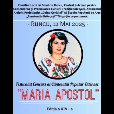 Numeroși interpreți o vor omagia prin cântec pe îndrăgita și regretata Maria Apostol. Spectacolul „Cântec pentru Maria Apostol” va avea loc pe 5 august, la Căminul Cultural din satul Bâlta al comunei Runcu, localitatea de baștină a marii artiste. Iubitorii muzicii populare autentice sunt așteptați la un eveniment excepțional unde intrarea va fi liberă! Pe scenă vor urca artiști precum Roxana Croitoru, Angelica Mirea, Petronela Bîrsilă, Ion Drăgan.