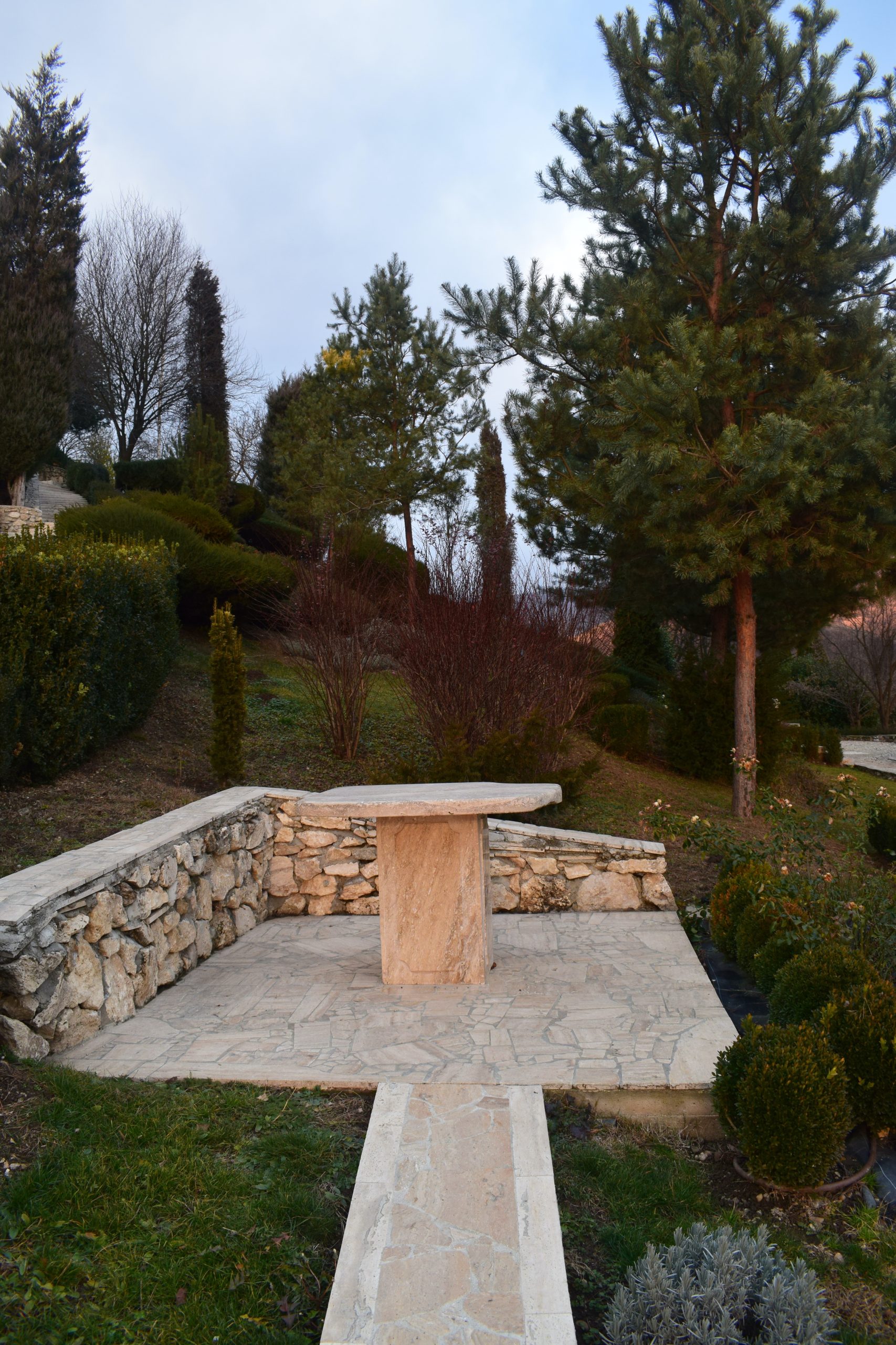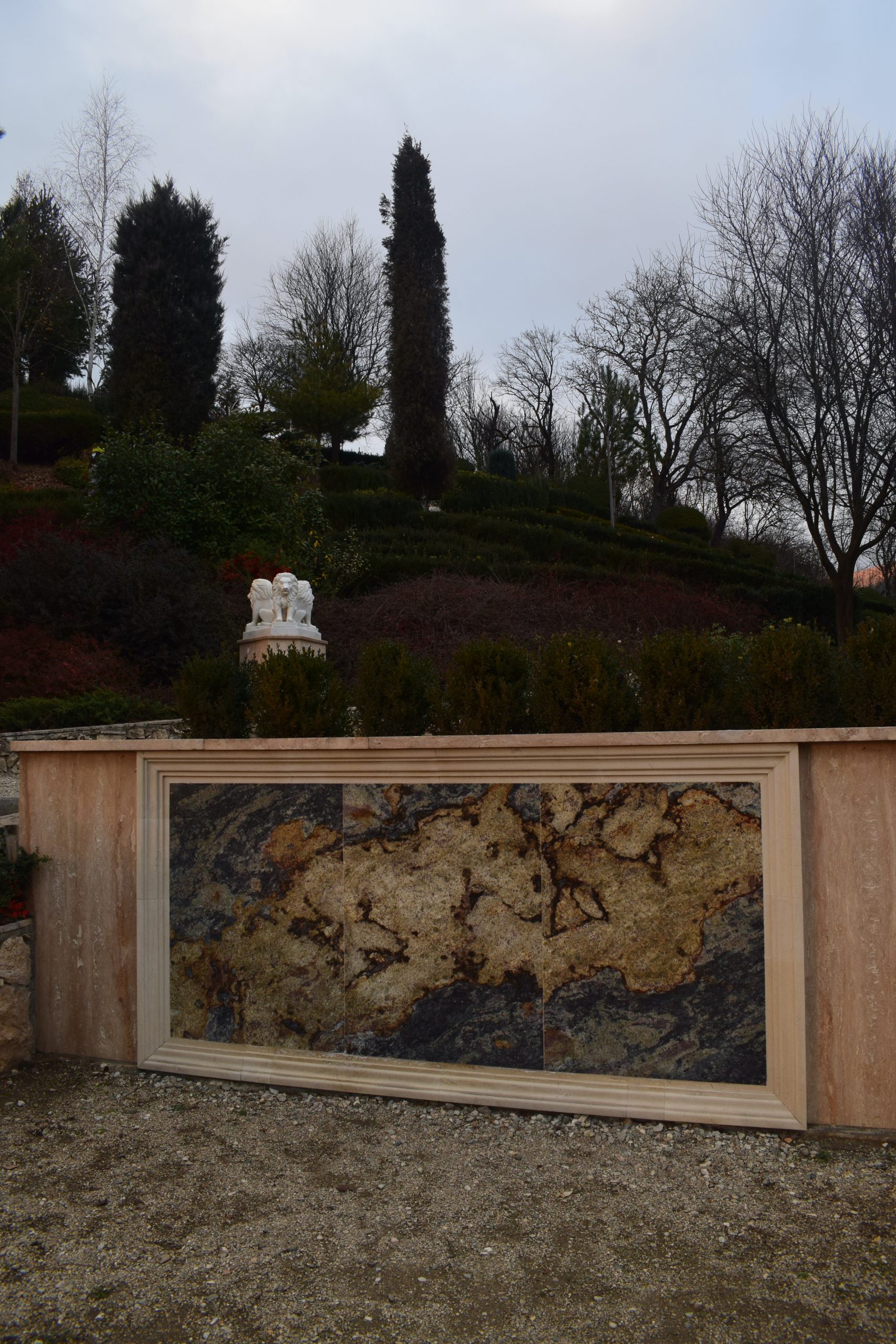 Un alt aspect ce mi-a atras atenția sunt obiectele de decor, sculptate în Italia, din rocă vulcanică, numită peperino. În același timp, granitul, marmura și travertinul se împletesc și ele armonios și întregesc tabloul din această grădină.
